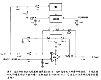 这IC能够完全操作于音频之上,引入的失真很少,因此而流行于高传真度的家用磁带录音机里。 NE570/NE571提供了三个积木式部件,可应用于1MHZ上,这些部件可配置成提供其他不少的功能,此与在目前数据图表中所示的简单压扩器不同。NE570/NE571的原装Sighetics消费者电路手册内提供有12页的应用电路,包括一人快上升、慢释放限制器、一个压控衰减器、一个可变斜率压扩器,以及一个自动电平控制电路。 在这两IC上还有其他变种出现,包括NE572,它把0dB参考设定于100MV上,适用于HI-FI录音室质素的系统上;另外SA577/SA578提供有一个电阻可编程0dB参考电压,可调节于10MV与1V之间——图3。