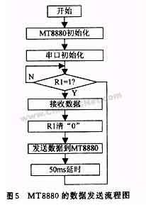 3 系统软件设计 3.1 MT8880的数据发送程序设计 MT8880的数据发送程序中用到了相应的串口接收程序,其程序流程图如图5所示。